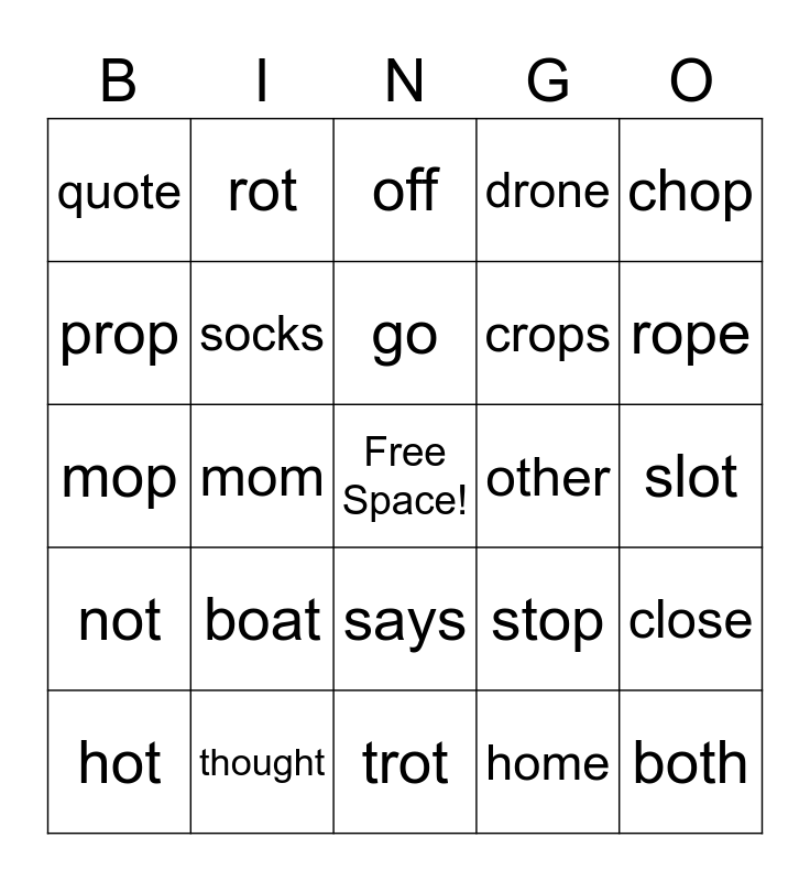 This bingo card has a free space and 34 words: top, home, tone, wrote, not, socks, chop, hot, rot, line, go, off, explode, low, other, rope, thought, mop, boat, stop, says, right, quote, slot, trot, both, drone, bot, crops, prop, hog, mom, close and flow.