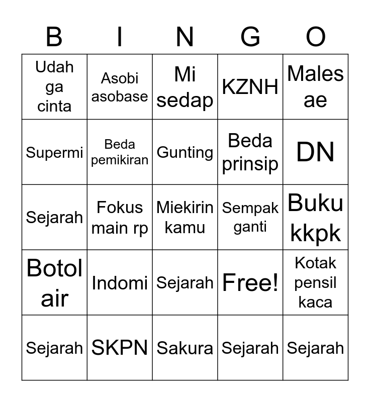 This bingo card has a free space and 24 words: Indomi, SKPN, Gunting, Sejarah, Males ae, Udah ga cinta, Supermi, Asobi asobase, Sempak ganti, Sejarah, Beda prinsip, Sejarah, Free!, Kotak pensil kaca, Beda pemikiran, Sejarah, Buku kkpk, Mi sedap, DN, Fokus main rp, Sejarah, Botol air, KZNH and Sakura.