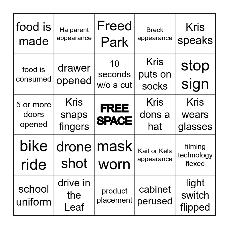 This bingo card has a free space and 24 words: drone shot, drive in the Leaf, 10 seconds w/o a cut, school uniform, Kris speaks, food is made, food is consumed, Ha parent appearance, Kris dons a hat, mask worn, Kris puts on socks, 5 or more doors opened, Kait or Kels appearance, filming technology flexed, drawer opened, cabinet perused, Kris wears glasses, Freed Park, stop sign, Kris snaps fingers, light switch flipped, bike ride, Breck appearance and product placement.