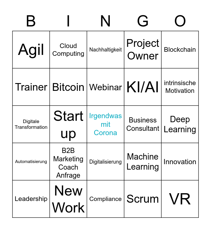 This bingo card has a free space and 24 words: B2B Marketing Coach Anfrage, New Work, Webinar, Leadership, Blockchain, Agil, Trainer, Cloud Computing, Business Consultant, Digitalisierung, KI/AI, Digitale Transformation, Machine Learning, Innovation, Bitcoin, Scrum, Deep Learning, Nachhaltigkeit, intrinsische Motivation, Start up, VR, Automatisierung, Project Owner and Compliance.
