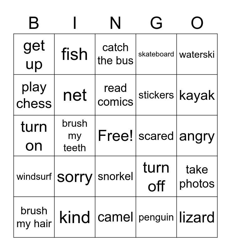 This bingo card has a free space and 29 words: brush my hair, walk to school, brush my teeth, get dressed, get up, catch the bus, net, sorry, scared, kind, angry, lizard, camel, penguin, kayak, swim, snorkel, windsurf, waterski, turn on, turn off, postcards, stickers, play chess, skateboard, fish, take photos, read comics and play basketball.