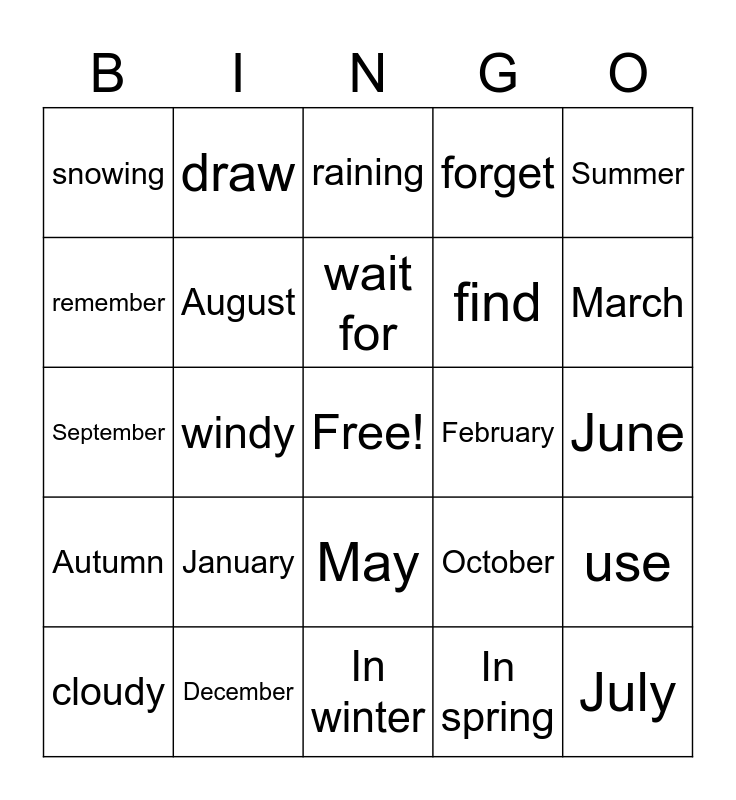 This bingo card has a free space and 29 words: cloudy, sunny, windy, foggy, snowing, raining, August, January, February, December, June, July, In winter, In spring, March, April, May, Autumn, Summer, September, October, Nevember, find, remember, forget, draw, use, wait for and buy.