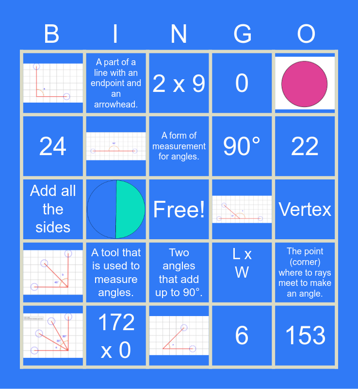 This bingo card has 8 images, a free space and 16 words: A tool that is used to measure angles., 172 x 0, A form of measurement for angles., 24, A part of a line with an endpoint and an arrowhead., Two angles that add up to 90°., 90°, Add all the sides, L x W, The point (corner) where to rays meet to make an angle., 6, Vertex, 2 x 9, 22, 153 and 0.