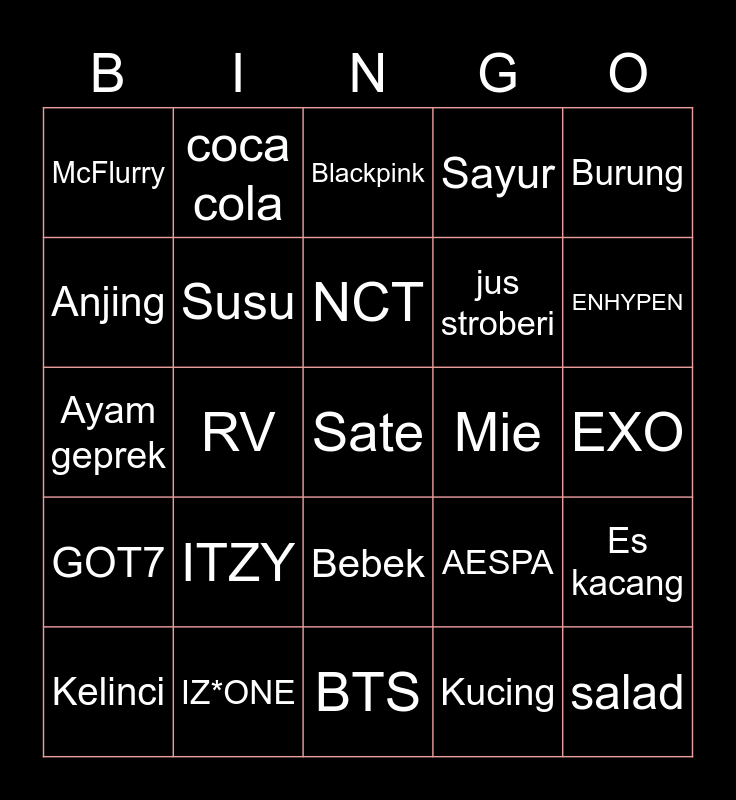 This bingo card has 25 words: ITZY, BTS, NCT, Kelinci, Burung, McFlurry, Anjing, coca cola, Mie, Bebek, jus stroberi, Ayam geprek, AESPA, Es kacang, Susu, salad, EXO, Blackpink, ENHYPEN, RV, Sate, IZ*ONE, GOT7, Sayur and Kucing.