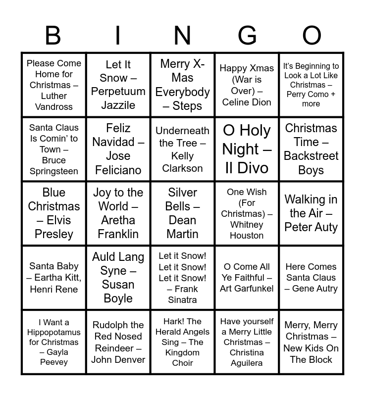 This bingo card has 35 words: All I want for Christmas is You – Mariah Carey, Last Christmas – Wham!, It’s the Most Wonderful Time of the Year – Andy Williams, Feliz Navidad – Jose Feliciano, Let it Snow! Let it Snow! Let it Snow! – Frank Sinatra, Happy Xmas (War is Over) – Celine Dion, Santa Claus Is Comin’ to Town – Bruce Springsteen, Merry Christmas Everyone – Shakin’ Stevens, Underneath the Tree – Kelly Clarkson, Sleigh Ride – The Ronettes, Blue Christmas – Elvis Presley, It’s Beginning to Look a Lot Like Christmas – Perry Como + more, Winter Wonderland – Tony Bennett, White Christmas – Michael Bolton, Please Come Home for Christmas – Luther Vandross, One Wish (For Christmas) – Whitney Houston, Have yourself a Merry Little Christmas – Christina Aguilera, Joy to the World – Aretha Franklin, Santa Baby – Eartha Kitt, Henri Rene, Silver Bells – Dean Martin, O Come All Ye Faithful – Art Garfunkel, I Want a Hippopotamus for Christmas – Gayla Peevey, Here Comes Santa Claus – Gene Autry, Rudolph the Red Nosed Reindeer – John Denver, Merry X-Mas Everybody – Steps, Christmas Time – Backstreet Boys, Merry, Merry Christmas – New Kids On The Block, God Rest Ye, Merry Gentleman – Kenny G, O Holy Night – Il Divo, Walking in the Air – Peter Auty, Silent Night – Only Boys Aloud, Hark! The Herald Angels Sing – The Kingdom Choir, Auld Lang Syne – Susan Boyle, Let It Snow – Perpetuum Jazzile and O Come, All Ye Faithful – Eva Cassidy.