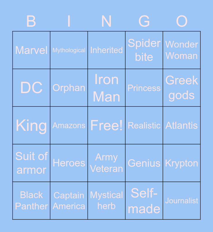 This bingo card has a free space and 24 words: Heroes, Captain America, Iron Man, Black Panther, Wonder Woman, Marvel, DC, Mythological, Realistic, Army Veteran, Princess, King, Genius, Krypton, Orphan, Self-made, Atlantis, Inherited, Greek gods, Amazons, Journalist, Suit of armor, Spider bite and Mystical herb.