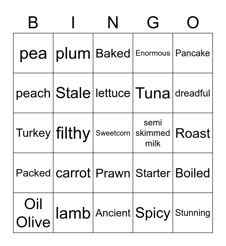 This bingo card has a free space and 24 words: carrot, lamb, lettuce, Oil Olive, Pancake, pea, peach, plum, semi skimmed milk, Prawn, Tuna, Turkey, Starter, Boiled, Stale, Spicy, Roast, Baked, dreadful, filthy, Stunning, Packed, Enormous and Ancient.