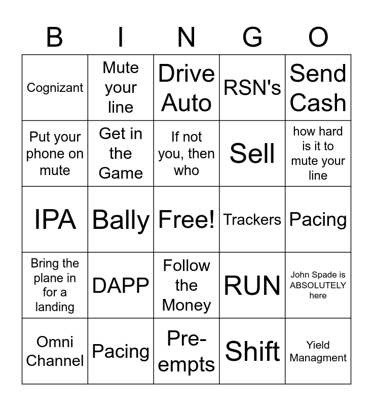 This bingo card has a free space and 24 words: DAPP, Pacing, If not you, then who, Omni Channel, Send Cash, Cognizant, Put your phone on mute, Mute your line, Trackers, Follow the Money, Sell, IPA, RUN, John Spade is ABSOLUTELY here, Get in the Game, Shift, Pacing, Drive Auto, how hard is it to mute your line, Bally, Yield Managment, Bring the plane in for a landing, RSN's and Pre-empts.