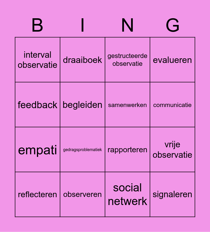 This bingo card has 16 words: observeren, vrije observatie, gestructeerde observatie, interval observatie, empati, draaiboek, rapporteren, social netwerk, feedback, begleiden, reflecteren, evalueren, gedragsproblematiek, communicatie, samenwerken and signaleren.