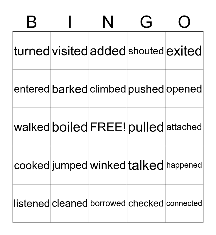 This bingo card has a free space and 24 words: jumped, cleaned, climbed, listened, exited, turned, entered, visited, pulled, winked, pushed, walked, talked, happened, barked, checked, attached, added, opened, boiled, connected, cooked, shouted and borrowed.