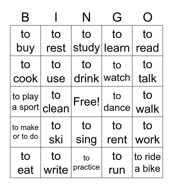 This bingo card has a free space and 24 words: to ski, to write, to drink, to eat, to read, to buy, to cook, to rest, to dance, to sing, to watch, to play a sport, to rent, to work, to use, to run, to walk, to study, to talk, to clean, to ride a bike, to make or to do, to learn and to practice.