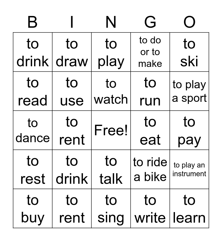 This bingo card has a free space and 24 words: to drink, to rent, to watch, to buy, to ski, to drink, to read, to draw, to eat, to talk, to run, to dance, to ride a bike, to play an instrument, to use, to write, to pay, to play, to play a sport, to rent, to learn, to rest, to do or to make and to sing.
