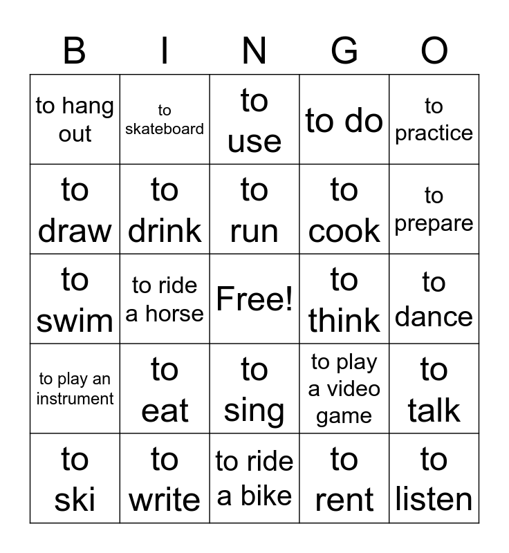 This bingo card has a free space and 24 words: to eat, to write, to run, to ski, to practice, to hang out, to draw, to skateboard, to think, to sing, to cook, to swim, to play a video game, to talk, to drink, to rent, to dance, to use, to prepare, to ride a horse, to listen, to play an instrument, to do and to ride a bike.