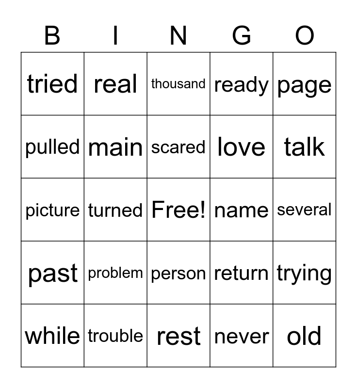 This bingo card has a free space and 150 words: left, less, letter, life, line, list, listen, live, long, looking, lost, lot, love, lunch, main, making, matter, maybe, mean, might, mind, miss, money, more, morning, most, move, name, near, need, never, next, nice, night, north, nothing, number, often, old, once, order, own, page, pair, paper, park, part, passed, past, people, perhaps, person, picture, pierce, plan, plants, point, possibly, present, pretty, probably, problem, pulled, question, quickly, ready, real, really, reason, rest, return, right, river, room, round, running, same, save, scared, school, second, seen, set, seventh, several, shall, solve, someone, soon, sound, south, space, special, stand, start, still, stood, store, story, stuff, such, suddenly, sure, talk, teach, teacher, tenth, than, that’s, themselves, they’re, things, think, third, those, though, thought, thousand, through, throw, told, took, trees, tried, trouble, true, trying, turned, understand, until, upon, voice, wanted, warm, wasn’t, watch, water, while, whole, window, winter, wish, without, woke, word, world, worn, wouldn’t, written and wrong.