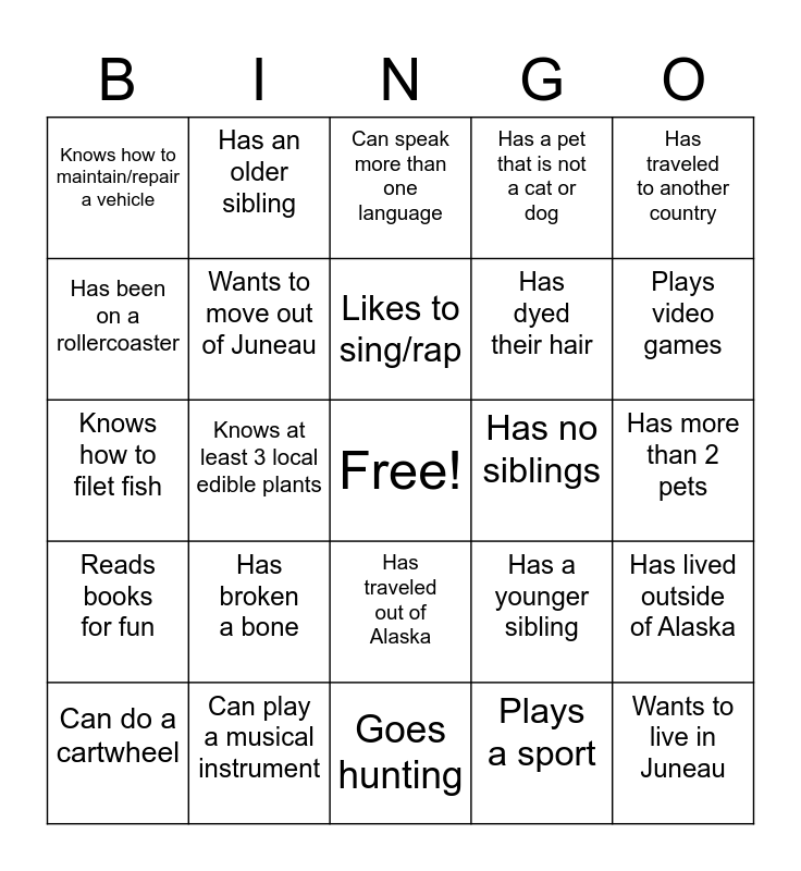 This bingo card has a free space and 24 words: Has broken a bone, Can play a musical instrument, Likes to sing/rap, Can do a cartwheel, Has traveled to another country, Knows how to maintain/repair a vehicle, Has been on a rollercoaster, Has an older sibling, Has no siblings, Has traveled out of Alaska, Has dyed their hair, Knows how to filet fish, Has a younger sibling, Has lived outside of Alaska, Wants to move out of Juneau, Plays a sport, Has more than 2 pets, Can speak more than one language, Plays video games, Knows at least 3 local edible plants, Wants to live in Juneau, Reads books for fun, Has a pet that is not a cat or dog and Goes hunting.