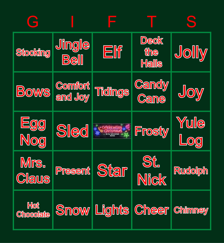 This bingo card has a free space and 45 words: Christmas, Chimney, Cookies, Hot Chocolate, Silver Bells, Cheer, Elf, Family, Jolly, Snow, Deck the Halls, Frosty, Star, Present, Christmas Tree, Lights, Noel, Egg Nog, Grinch, Joy, Jingle Bell, Jack Frost, Coal, Stocking, Ornament, Yule Log, Toys, Peppermint Stick, St. Nick, Mrs. Claus, Let it Snow, Rudolph, Mistletoe, Holly, Nutcracker, Sled, Poinsetta, Chestnuts, Tinsel, Tidings, Bows, Candy Cane, Wreath, Comfort and Joy and Believe.