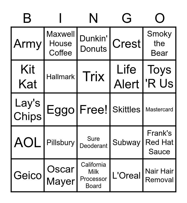 This bingo card has a free space and 24 words: Geico, Pillsbury, Trix, L'Oreal, Smoky the Bear, Army, Maxwell House Coffee, Dunkin' Donuts, Skittles, Mastercard, Lay's Chips, Hallmark, Subway, Frank's Red Hat Sauce, Kit Kat, Oscar Mayer, California Milk Processor Board, Crest, Toys 'R Us, AOL, Eggo, Sure Deoderant, Life Alert and Nair Hair Removal.