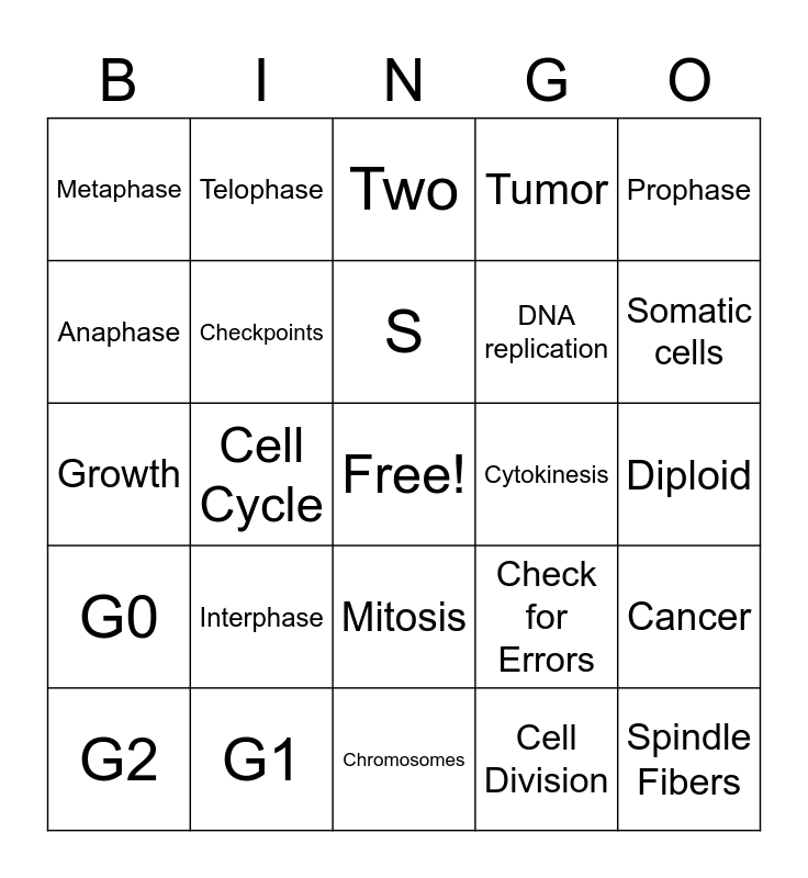 This bingo card has a free space and 24 words: Interphase, G1, S, G2, Prophase, Metaphase, Anaphase, Telophase, Cytokinesis, Mitosis, DNA replication, Growth, Check for Errors, Cancer, Checkpoints, Cell Division, Diploid, Two, Somatic cells, Cell Cycle, Spindle Fibers, G0, Tumor and Chromosomes.