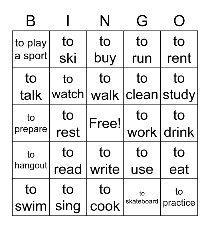 This bingo card has a free space and 24 words: to read, to sing, to walk, to swim, to rent, to play a sport, to talk, to ski, to work, to write, to clean, to prepare, to use, to eat, to watch, to skateboard, to drink, to buy, to study, to rest, to practice, to hangout, to run and to cook.