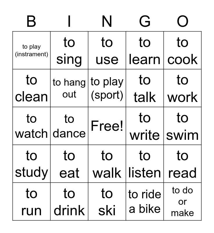 This bingo card has a free space and 24 words: to eat, to drink, to play (sport), to run, to cook, to play (instrament), to clean, to sing, to write, to walk, to talk, to watch, to listen, to read, to hang out, to ride a bike, to swim, to use, to work, to dance, to do or make, to study, to learn and to ski.