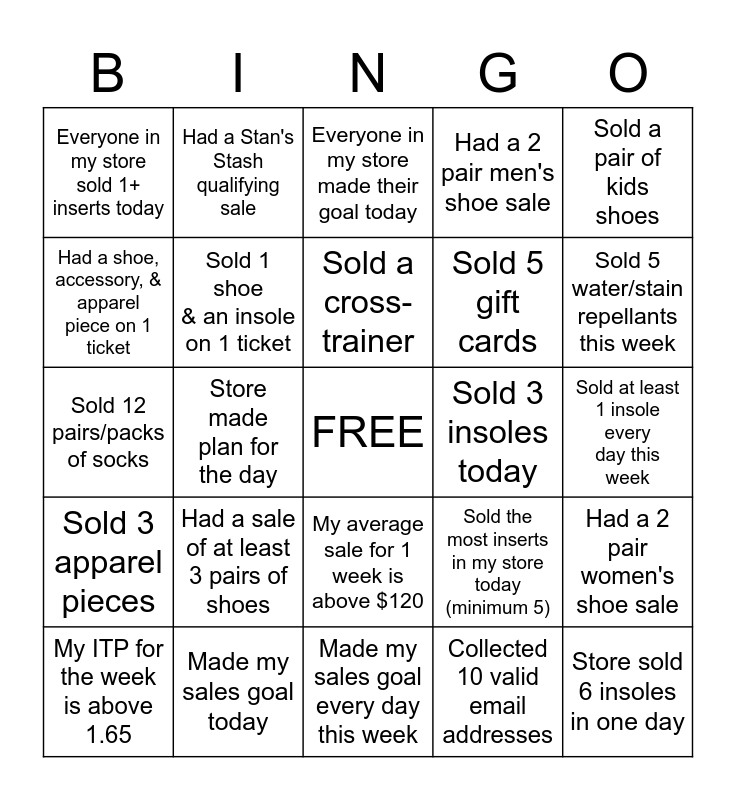 This bingo card has a free space and 24 words: Had a sale of at least 3 pairs of shoes, Made my sales goal today, Sold a cross-trainer, My ITP for the week is above 1.65, Sold a pair of kids shoes, Everyone in my store sold 1+ inserts today, Had a shoe, accessory, & apparel piece on 1 ticket, Had a Stan's Stash qualifying sale, Sold 3 insoles today, My average sale for 1 week is above $120, Sold 5 gift cards, Sold 12 pairs/packs of socks, Sold the most inserts in my store today (minimum 5), Had a 2 pair women's shoe sale, Sold 1 shoe & an insole on 1 ticket, Collected 10 valid email addresses, Sold at least 1 insole every day this week, Everyone in my store made their goal today, Sold 5 water/stain repellants this week, Store made plan for the day, Store sold 6 insoles in one day, Sold 3 apparel pieces, Had a 2 pair men's shoe sale and Made my sales goal every day this week.