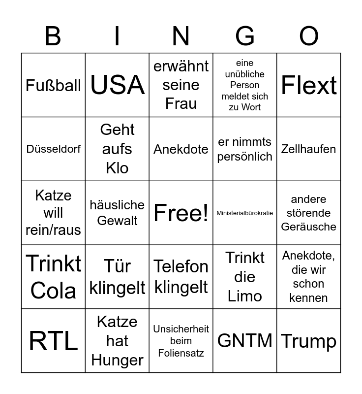 This bingo card has a free space and 24 words: Tür klingelt, Katze hat Hunger, Anekdote, RTL, Flext, Fußball, Düsseldorf, USA, Ministerialbürokratie, Telefon klingelt, er nimmts persönlich, Katze will rein/raus, Trinkt die Limo, Anekdote, die wir schon kennen, Geht aufs Klo, GNTM, andere störende Geräusche, erwähnt seine Frau, Zellhaufen, häusliche Gewalt, Trump, Trinkt Cola, eine unübliche Person meldet sich zu Wort and Unsicherheit beim Foliensatz.
