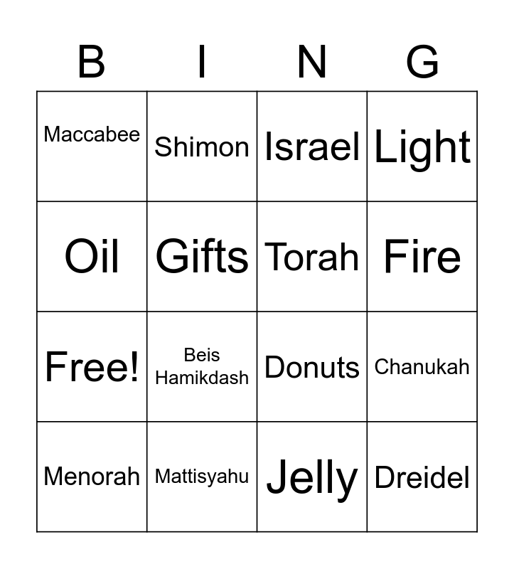 This bingo card has 20 words: Chanukah, Antiochus, Israel, Yochanan, Menorah, Oil, Mattisyahu, Maccabee, Free!, Shimon, Beis Hamikdash, Donuts, Gifts, Dreidel, Torah, Bris Mila, Fire, Light, Jelly and Custard.