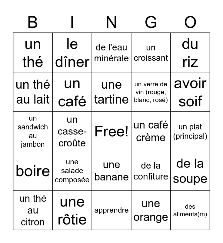 This bingo card has a free space and 84 words: un citron pressé, un coca, de l'eau minérale, de l'eau plate, de l'eau gazeuse, un jus, un just de fruits, une limonade, un Orangina, un thé glacé, des boissons chaudes, des boissons rafraîchissantes, un café, un café crème, un chocolat chaud, un thé, un thé au citron, un thé au lait, un thé nature, des boissons alcoolisées, une bière, un verre de vin (rouge, blanc, rosé), des aliments(m), un café gourmand, un casse-croûte, un croque-monsieur, un croque-madame, des frites(f), une glace, une pizza, une salade composée, une salade verte, un sandwich, un sandwich au jambon, un sandwich au fromage, sans glaçons, apprendre, avoir faim, avoir soif, boire, commander, je voudrais, les repas, le petit-déjeuner, le déjeuner, le goûter, le dîner, du bacon, du beurre, un café au lait, des céréales, de la confiture, un croissant, un oeuf, un oeuf sur le plat, du pain, une rôtie, une tartine, une entrée, un plat (principal), un dessert, un biscuit, du fromage, des haricots, des haricots verts, un légume, une pomme de terre, du poulet, du riz, du riz complet, de la soupe, une tarte, une tarte aux pommes, des fruits, une banane, une orange, une poire, une pomme, du raisin, des épices, du sel, du poivre, sur la table and une assiette.