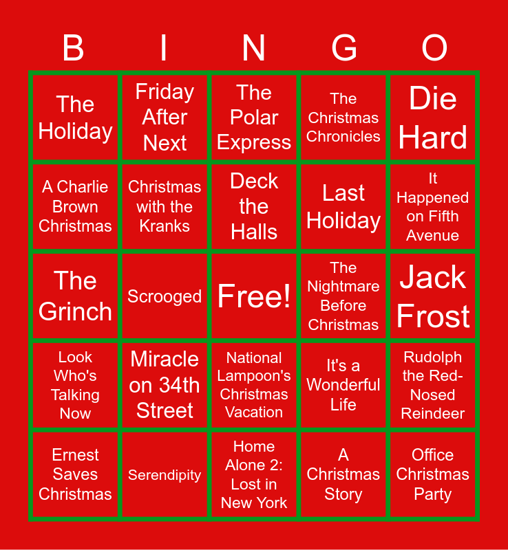 This bingo card has a free space and 34 words: Elf, A Christmas Story, Bad Santa, Gremlins, Look Who's Talking Now, Christmas with the Kranks, Die Hard, Ernest Saves Christmas, Friday After Next, Trading Places, Deck the Halls, The Polar Express, Home Alone, Noel, The Nightmare Before Christmas, It Happened on Fifth Avenue, Serendipity, The Grinch, Miracle on 34th Street, It's a Wonderful Life, National Lampoon's Christmas Vacation, Prancer, The Holiday, Jack Frost, Home Alone 2: Lost in New York, Office Christmas Party, The Christmas Chronicles, Klaus, Last Holiday, A Charlie Brown Christmas, The Muppet Christmas Carol, Scrooged, Rudolph the Red-Nosed Reindeer and Frosty the Snowman.
