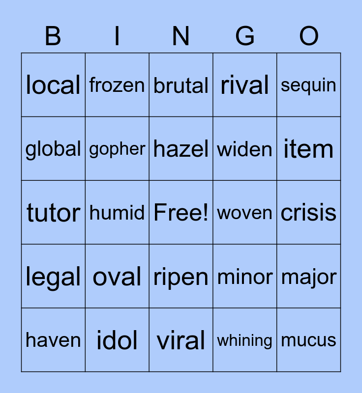 This bingo card has a free space and 24 words: oval, idol, hazel, haven, sequin, local, global, frozen, woven, ripen, widen, tutor, minor, major, gopher, whining, crisis, brutal, item, humid, mucus, legal, rival and viral.