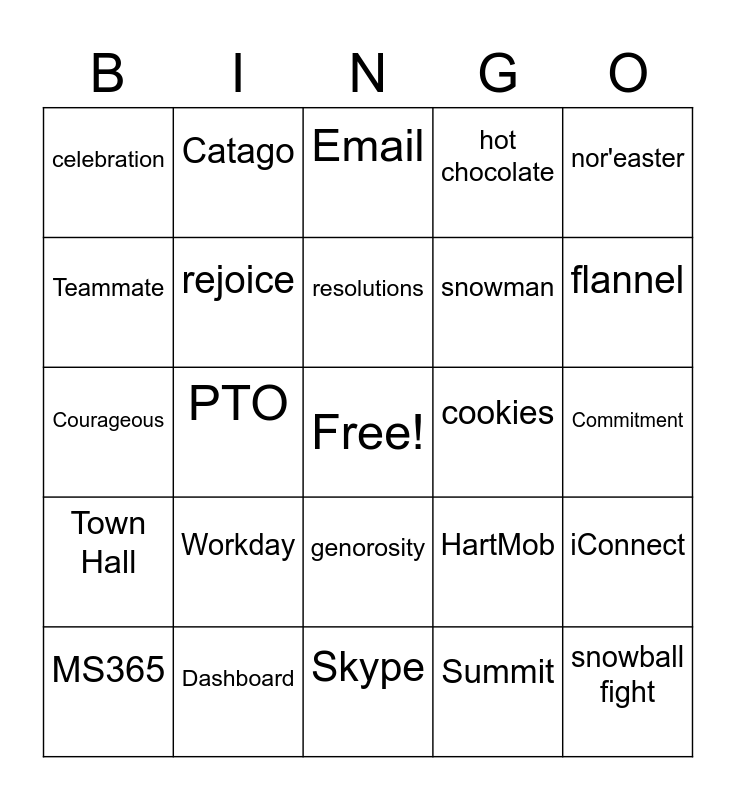 This bingo card has a free space and 24 words: Workday, Dashboard, resolutions, MS365, nor'easter, celebration, Teammate, Catago, cookies, genorosity, snowman, Courageous, HartMob, iConnect, rejoice, Summit, Commitment, Email, flannel, PTO, snowball fight, Town Hall, hot chocolate and Skype.