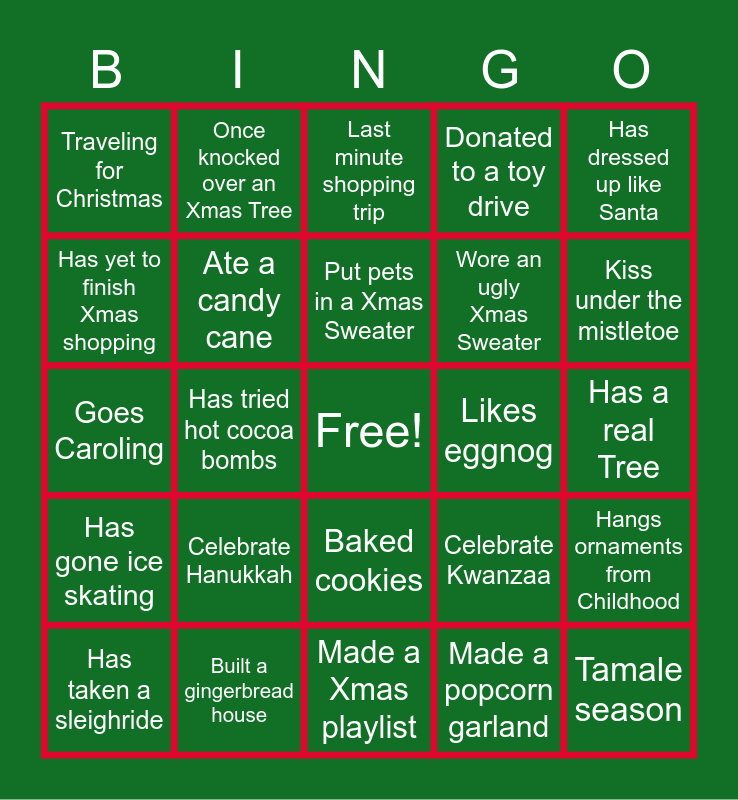 This bingo card has a free space and 24 words: Celebrate Hanukkah, Built a gingerbread house, Put pets in a Xmas Sweater, Has taken a sleighride, Has dressed up like Santa, Traveling for Christmas, Has yet to finish Xmas shopping, Once knocked over an Xmas Tree, Likes eggnog, Baked cookies, Wore an ugly Xmas Sweater, Goes Caroling, Celebrate Kwanzaa, Hangs ornaments from Childhood, Ate a candy cane, Made a popcorn garland, Has a real Tree, Last minute shopping trip, Kiss under the mistletoe, Has tried hot cocoa bombs, Tamale season, Has gone ice skating, Donated to a toy drive and Made a Xmas playlist.