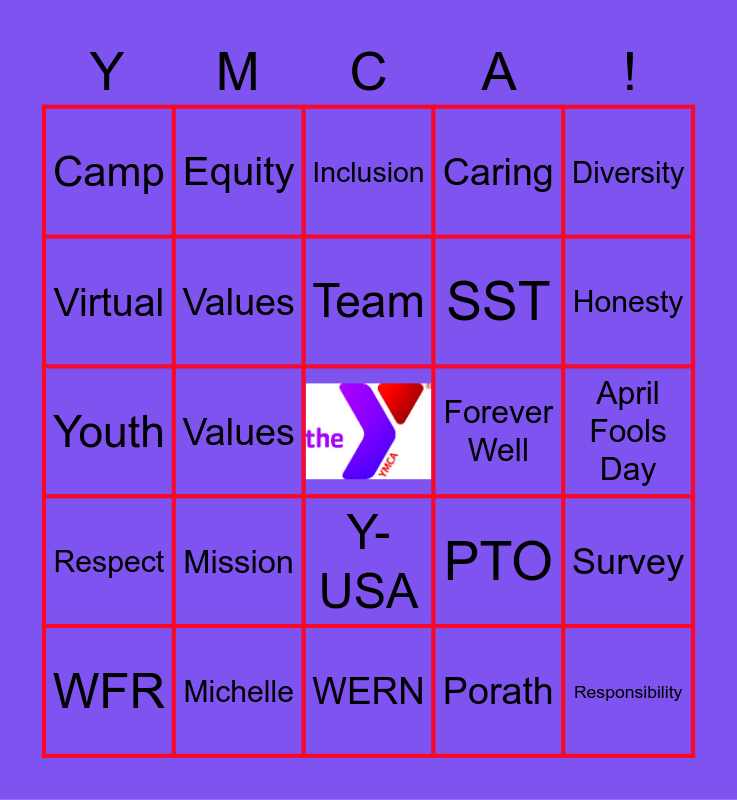 This bingo card has a free space and 24 words: Mission, Michelle, Team, WFR, Diversity, Camp, Virtual, Equity, Forever Well, Y-USA, SST, Youth, PTO, Survey, Values, Porath, April Fools Day, Inclusion, Honesty, Values, Responsibility, Respect, Caring and WERN.