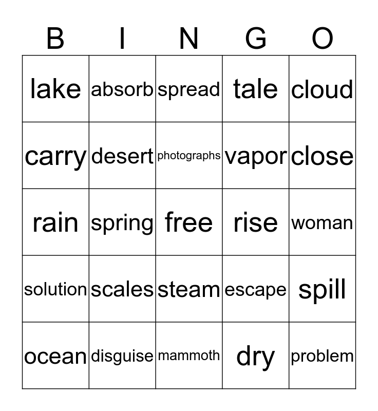 This bingo card has a free space and 24 words: scales, disguise, photographs, ocean, cloud, lake, carry, absorb, rise, steam, vapor, rain, escape, spill, desert, dry, woman, spread, close, spring, problem, solution, tale and mammoth.