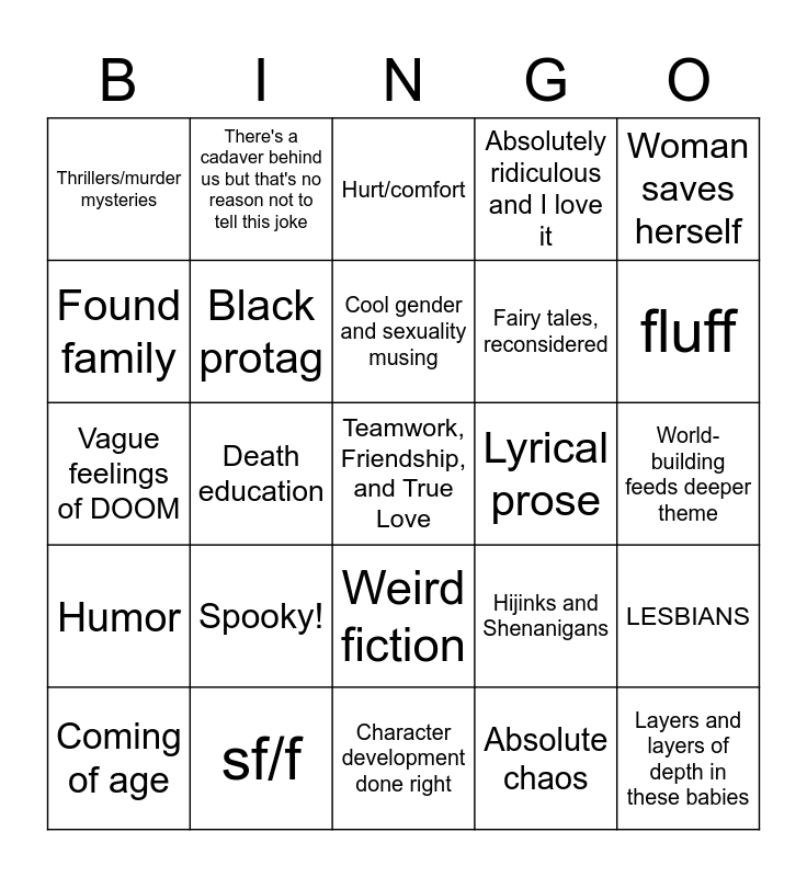 This bingo card has a free space and 24 words: Spooky!, sf/f, Cool gender and sexuality musing, Coming of age, Woman saves herself, Thrillers/murder mysteries, Found family, There's a cadaver behind us but that's no reason not to tell this joke, Lyrical prose, Weird fiction, Fairy tales, reconsidered, Vague feelings of DOOM, Hijinks and Shenanigans, LESBIANS, Black protag, Absolute chaos, World-building feeds deeper theme, Hurt/comfort, fluff, Death education, Layers and layers of depth in these babies, Humor, Absolutely ridiculous and I love it and Character development done right.