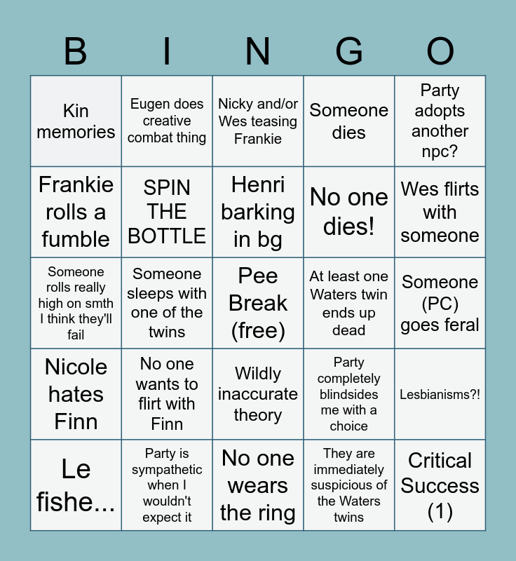 This bingo card has a free space and 24 words: No one wants to flirt with Finn, Party is sympathetic when I wouldn't expect it, Henri barking in bg, Le fishe..., Party adopts another npc?, Kin memories, Frankie rolls a fumble, Eugen does creative combat thing, At least one Waters twin ends up dead, Wildly inaccurate theory, No one dies!, Someone rolls really high on smth I think they'll fail, Party completely blindsides me with a choice, Lesbianisms?!, SPIN THE BOTTLE, They are immediately suspicious of the Waters twins, Someone (PC) goes feral, Nicky and/or Wes teasing Frankie, Wes flirts with someone, Someone sleeps with one of the twins, Critical Success (1), Nicole hates Finn, Someone dies and No one wears the ring.