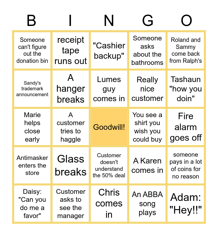 This bingo card has a free space and 29 words: Daisy: "Can you do me a favor", You hit goal, A customer tries to haggle, Yvette: "wassup", Someone can't figure out the donation bin, "Cashier backup", A hanger breaks, Glass breaks, You see a shirt you wish you could buy, Customer asks to see the manager, Fire alarm goes off, Adam: "Hey!!", Chris comes in, An ABBA song plays, Tashaun "how you doin", Shirley: "Oh Lord", Customer doesn't understand the 50% deal, Antimasker enters the store, Roland and Sammy come back from Ralph's, Marie helps close early, A Karen comes in, A baby starts crying when you have to scan a toy, Really nice customer, Sandy's trademark announcement, Someone asks about the bathrooms, receipt tape runs out, someone pays in a lot of coins for no reason, Lumes guy comes in and Two calls in a row come in.