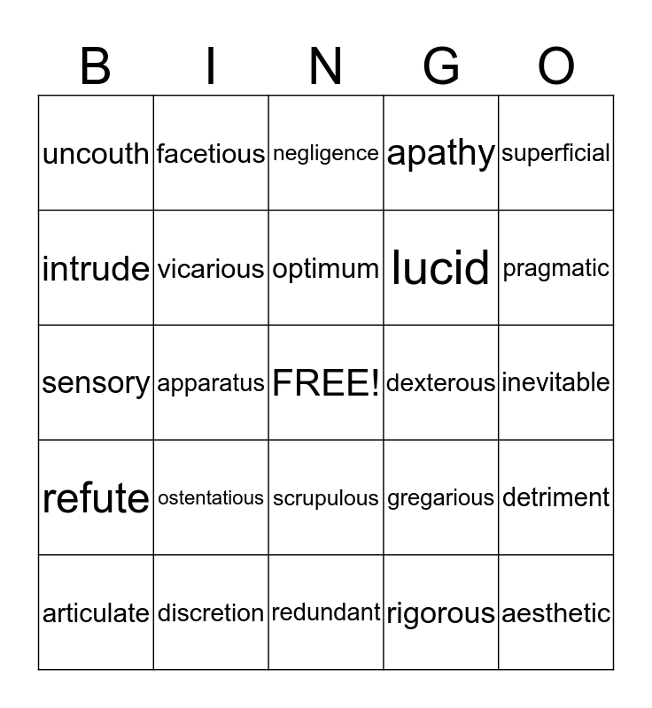 This bingo card has a free space and 24 words: ostentatious, discretion, optimum, articulate, superficial, uncouth, intrude, facetious, dexterous, scrupulous, lucid, sensory, gregarious, detriment, vicarious, rigorous, inevitable, negligence, pragmatic, apparatus, aesthetic, refute, apathy and redundant.