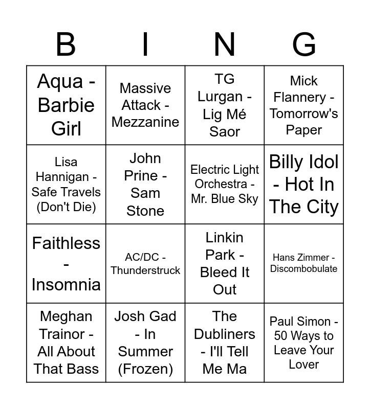 This bingo card has 154 words: Free!, Rihanna - Umbrella, Pearl Jam - Jeremy, Nizlopi - JCB, Richie Kavanagh - Aon Focal Eile, The Pogues - A Rainy Night in Soho, The Boomtown Rats - I Don't Like Mondays, Yusuf / Cat Stevens - (Remember The Days Of The) Old Schoolyard, Travis - Why Does It Always Rain On Me?, Pink Floyd - Another Brick In The Wall, Eurythmics - Here Comes the Rain Again, Ennio Morricone - Gabriel's Oboe, Faithless - Insomnia, Faithless - Mass Destruction, The Dubliners - I'll Tell Me Ma, Lisa Hannigan - Safe Travels (Don't Die), Nino Rota - Love Theme From "The Godfather", Franz Ferdinand - Take Me Out, Sigma, Rita Ora - Coming Home, Simon & Garfunkel - Homeward Bound, John Denver - Take Me Home, Country Roads, Stevie Nicks - Edge of Seventeen, Iron Maiden - The Number of the Beast, Metallica - One, JAY-Z - 99 Problems, Blur - Song 2, Ariana Grande - 7 rings, Paul Simon - 50 Ways to Leave Your Lover, Nena - 99 Red Balloons, Clamavi De Profundis - One Ring to Rule Them All, Embrace - 3 Is A Magic Number, Travie McCoy - Billionaire (feat. Bruno Mars), Bob Marley & The Wailers - One Love / People Get Ready - Medley, Swedish House Mafia, Tinie Tempah - Miami 2 Ibiza, Steps - 5, 6, 7, 8, The White Stripes - Seven Nation Army, Katrina & The Waves - Walking On Sunshine, Paolo Nutini - Candy, Johnny Cash - You Are My Sunshine, The Beatles - Here Comes The Sun, Calvin Harris - Summer, DJ Jazzy Jeff & The Fresh Prince - Summertime, Josh Gad - In Summer (Frozen), Avicii - Wake Me Up, Violent Femmes - Blister In The Sun, Queen - We Are The Champions, Survivor - Eye of the Tiger, Elton John - I'm Still Standing, Tina Turner - The Best, The Prodigy - Firestarter, Endor - Pump It Up, AC/DC - Thunderstruck, Everything But The Girl - Missing, Arcade Fire - Neighborhood #1 (Tunnels), The Chemical Brothers - The Salmon Dance, Passion Pit - The Reeling, The Shins - New Slang, The Chemical Brothers - Galvanize, Richard Hawley - Standing At the Sky's Edge, Wilco - Sky Blue Sky, Massive Attack - Mezzanine, TOOL - Lateralus, The Chainsmokers, Coldplay - Something Just Like This, Coldplay - Clocks, Donny Osmond - Puppy Love, John Legend - Tonight (Best You Ever Had), Five - Everybody Get Up, Alladin - A Whole New World, Linkin Park - In the End, Shakira - Try Everything, Michael Jackson - Someone in the Dark, Backstreet Boys - Everybody (Backstreet's Back), Robbie Williams - Rock DJ, Deee-Lite - Groove Is in the Heart, BT, Paul van Dyk - Flaming June, Nina Simone, Felix Da Housecat - Sinnerman, Bill Withers - Lovely Day, Dean Martin - That's Amore, Vampire Weekend - A-Punk, The Underdog Project - Summer Jam 2003, Madonna - La Isla Bonita, Meghan Trainor - All About That Bass, McAlmont & Butler - Yes, Lionel Richie - Dancing On The Ceiling, Hans Zimmer - Discombobulate, Electric Light Orchestra - Mr. Blue Sky, Talking Heads - This Must Be the Place, Vengaboys - We like to Party!, Scatman John - Scatman, Bee Gees - Stayin' Alive, Aqua - Barbie Girl, Hot Chip - Dancing In The Dark, Elbow - One Day Like This, Dire Straits - Walk Of Life, Linkin Park - Bleed It Out, The Coronas - San Diego Song, Wham! - Wake Me Up Before You Go-Go, Donald Fagen - Ruby Baby, Coldplay - A Sky Full of Stars, Bill Whelan - Riverdance, Vanilla Ice - Ice Ice Baby, Namewee - 鬼島 (Ghost Town), John Prine - Sam Stone, Amy Winehouse - Love Is A Losing Game, Michael Jackson - She's Out of My Life, Jamiroquai - Seven Days in Sunny June, Don Henley - The Boys Of Summer, Green Day - Holiday, M.I.A. - Paper Planes, K'NAAN - Wavin' Flag, Otis Redding - (Sittin' On) the Dock of the Bay, Billy Idol - Hot In The City, The Verve - Bitter Sweet Symphony, TG Lurgan - Lig Mé Saor, The Coronas - Taibhse Nó Laoch(ra), TG Lurgan - Amhrán na gCugán (Cup Song), Horslips - Dearg Doom, Na Fíréin - Deire Na Seachtaine, The Dubliners - Oro Sé Do Bheatha' Bhaile, Gilberto Gil - Vamos Fugir, Sérgio Mendes, Black Eyed Peas - Mas Que Nada, Na Casaidigh - Trasna Na Dtonnta (Over the Waves), Stiff Little Fingers - Alternative Ulster, Vinicio Capossela - All'una e trentacinque circa, Green Day - American Idiot, PJ Harvey - Big Exit, Foo Fighters - The Pretender, Damien Rice - Cannonball, Sigma, Ella Henderson - Glitterball, blink-182 - First Date, Amy Winehouse - Back To Black, Mick Flannery - Tomorrow's Paper, Richmond Fontaine - Barely Losing, Cowboy Junkies - Sweet Jane, Linkin Park - Somewhere I Belong, Coldplay - Viva La Vida, Aslan, Don Mescall - Catch Your Fall, Pink Floyd - Wish You Were Here, Snow Patrol - Run, Billy Ocean - Love Really Hurts Without You, OutKast - Hey Ya!, Alphaville - Forever Young, Adele - Someone Like You, Tori Amos - Winter, Oh Wonder - All We Do, Joshua Radin - Winter, The Adventures - Broken Land, Tears For Fears, Oleta Adams - Woman In Chains, Green Day - Good Riddance (Time of Your Life), Joy Division - Love Will Tear Us Apart, The The - Kingdom of Rain, Johnny Cash - Hurt, Dean Lewis - Be Alright and Kodaline - All I Want.