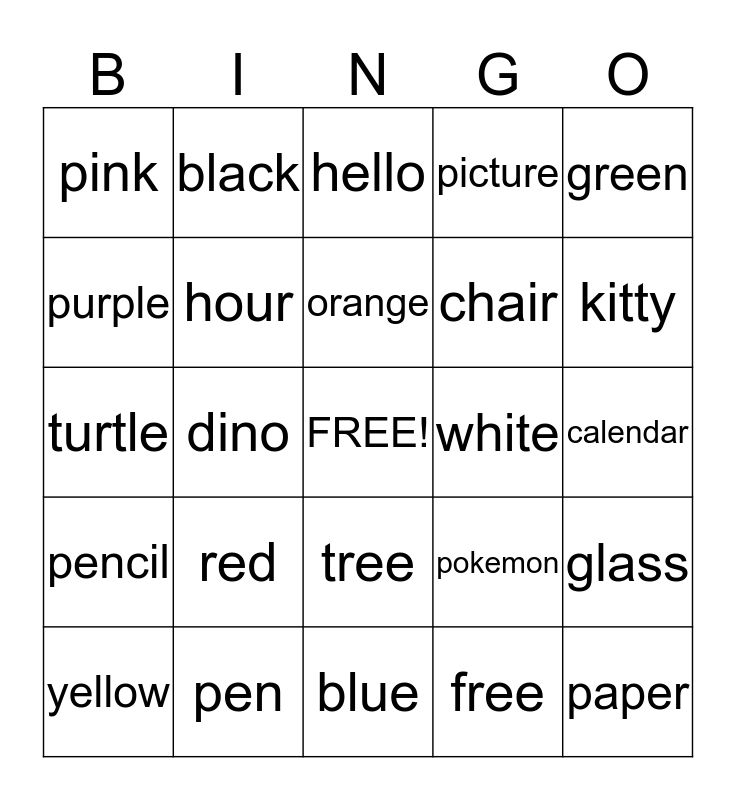 This bingo card has a free space and 25 words: red, blue, orange, yellow, green, pink, purple, black, white, tree, chair, turtle, pokemon, glass, hour, cup, calendar, hello, kitty, dino, paper, pen, pencil, picture and free.