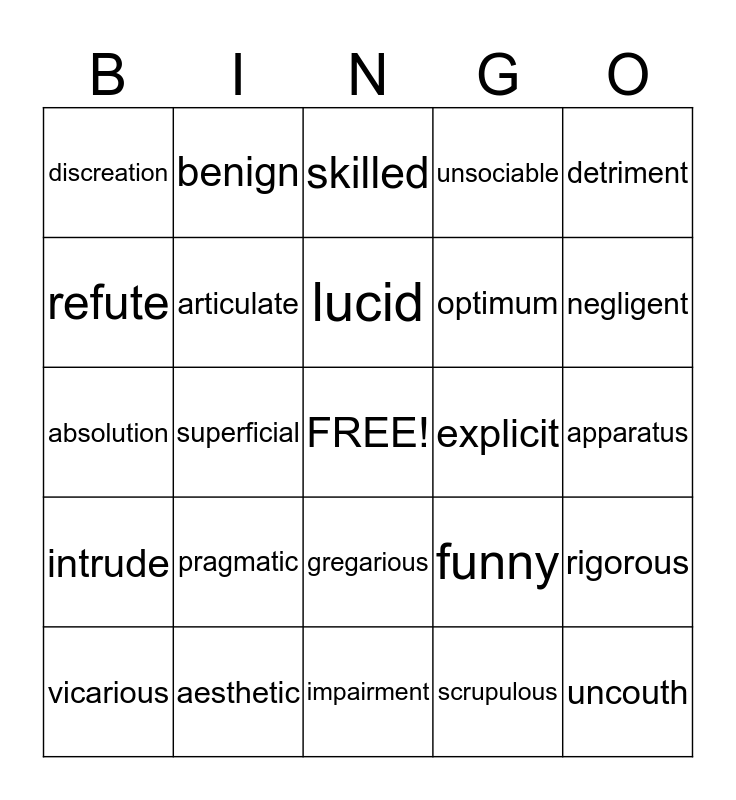 This bingo card has a free space and 24 words: pragmatic, aesthetic, lucid, vicarious, detriment, discreation, refute, benign, explicit, gregarious, optimum, absolution, funny, rigorous, articulate, scrupulous, apparatus, skilled, negligent, superficial, uncouth, intrude, unsociable and impairment.