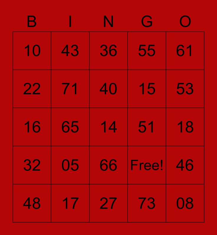 This bingo card has 25 words: 05, 27, 40, 48, 61, 10, 22, 43, 51, 66, 15, 16, Free!, 46, 71, 08, 18, 36, 53, 65, 14, 17, 32, 55 and 73.