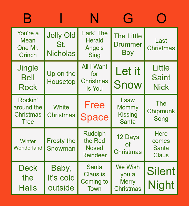 This bingo card has a free space and 24 words: Frosty the Snowman, Baby, It's cold outside, All I Want for Christmas Is You, Deck the Halls, Last Christmas, You're a Mean One Mr. Grinch, Jingle Bell Rock, Jolly Old St. Nicholas, I saw Mommy Kissing Santa, Rudolph the Red Nosed Reindeer, Let it Snow, Rockin' around the Christmas Tree, 12 Days of Christmas, Here comes Santa Claus, Up on the Housetop, We Wish you a Merry Christmas, The Chipmunk Song, Hark! The Herald Angels Sing, Little Saint Nick, White Christmas, Silent Night, Winter Wonderland, The Little Drummer Boy and Santa Claus is Coming to Town.