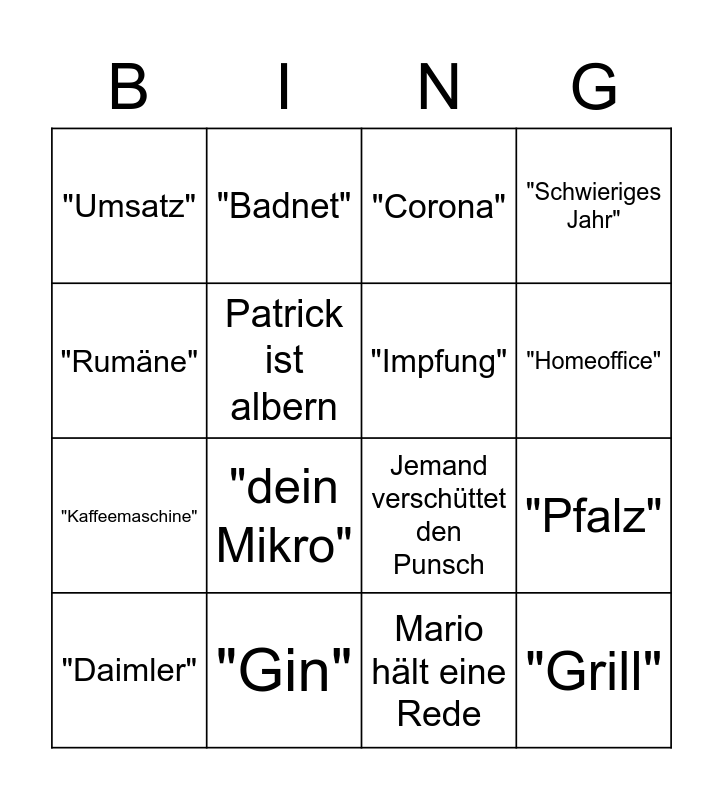 This bingo card has 16 words: "Gin", "Pfalz", "Corona", "Umsatz", "Kaffeemaschine", "Badnet", Jemand verschüttet den Punsch, Mario hält eine Rede, "Rumäne", Patrick ist albern, "Daimler", "Schwieriges Jahr", "dein Mikro", "Homeoffice", "Impfung" and "Grill".