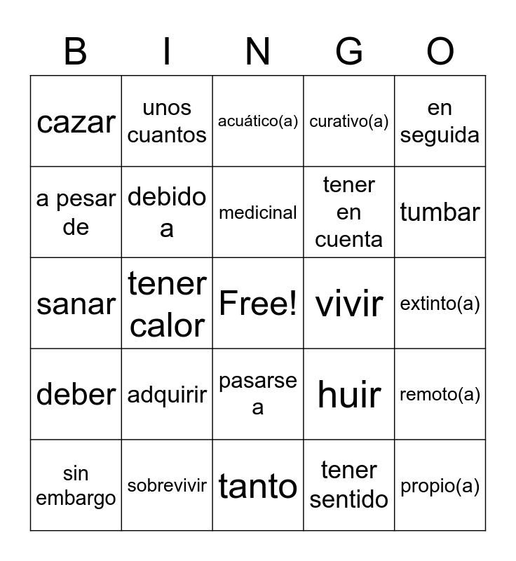 This bingo card has a free space and 34 words: tener 16 años, tener sentido, tener sed, tener frío, deber, debido a, en seguida, sin embargo, unos cuantos, tropical, medicinal, acuático(a), sencillo(a), valeroso(a), vivir, tumbar, sobrevivir, sanar, adquirir, huir, pasarse a, alimentar, cazar, extinto(a), tanto, propio(a), curativo(a), tradicional, tener en cuenta, a pesar de, tener cuidado, tener calor, remoto(a) and botar.