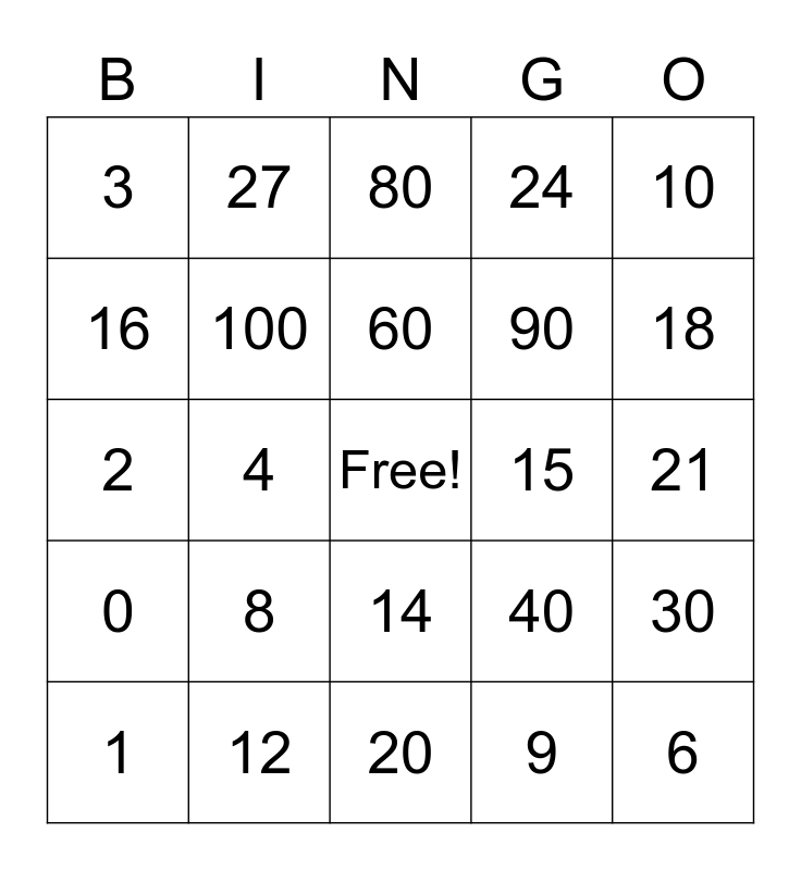 This bingo card has a free space and 24 words: 8, 12, 60, 1, 10, 3, 16, 27, 15, 14, 90, 2, 40, 30, 100, 9, 21, 80, 18, 4, 6, 0, 24 and 20.