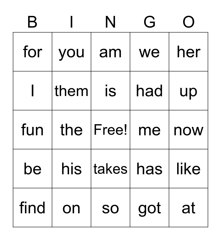 This bingo card has a free space and 34 words: by, got, they, way, be, them, her, find, you, what, is, am, with, my, me, up, on, fun, his, has, takes, and, for, now, so, at, we, to, had, I, are, the, like and was.