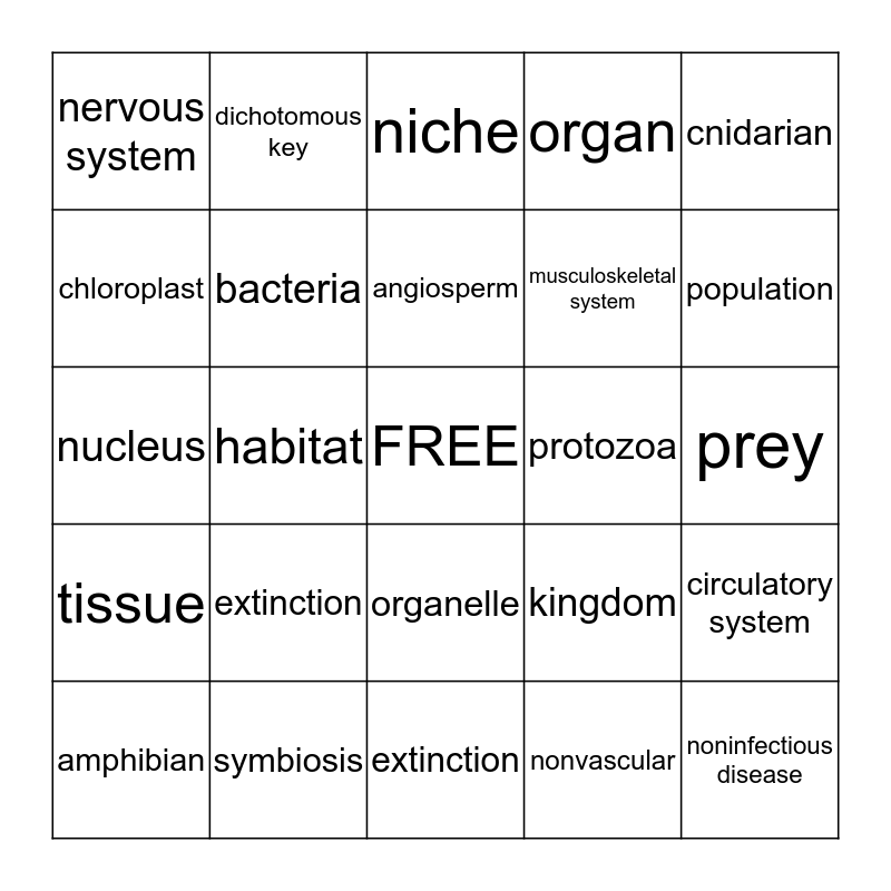 This bingo card has a free space and 24 words: extinction, symbiosis, angiosperm, amphibian, cnidarian, nervous system, chloroplast, dichotomous key, protozoa, organelle, musculoskeletal system, nucleus, kingdom, circulatory system, bacteria, nonvascular, prey, niche, population, habitat, noninfectious disease, tissue, organ and extinction.
