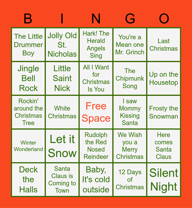 This bingo card has a free space and 24 words: Let it Snow, Santa Claus is Coming to Town, All I Want for Christmas Is You, Deck the Halls, Last Christmas, The Little Drummer Boy, Jingle Bell Rock, Jolly Old St. Nicholas, I saw Mommy Kissing Santa, Rudolph the Red Nosed Reindeer, The Chipmunk Song, Rockin' around the Christmas Tree, We Wish you a Merry Christmas, Here comes Santa Claus, Little Saint Nick, 12 Days of Christmas, Frosty the Snowman, Hark! The Herald Angels Sing, Up on the Housetop, White Christmas, Silent Night, Winter Wonderland, You're a Mean one Mr. Grinch and Baby, It's cold outside.