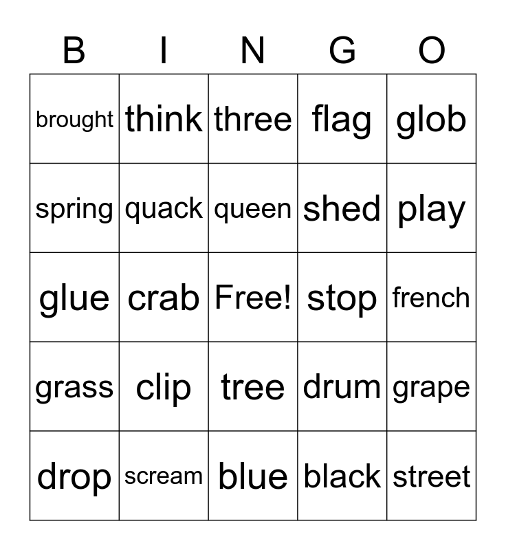 This bingo card has a free space and 29 words: drop, shark, crab, cry, brought, three, quack, clip, stop, scream, french, street, blue, black, play, plot, tree, grass, glob, glue, drum, she, shed, spring, flag, think, grape, queen and school.